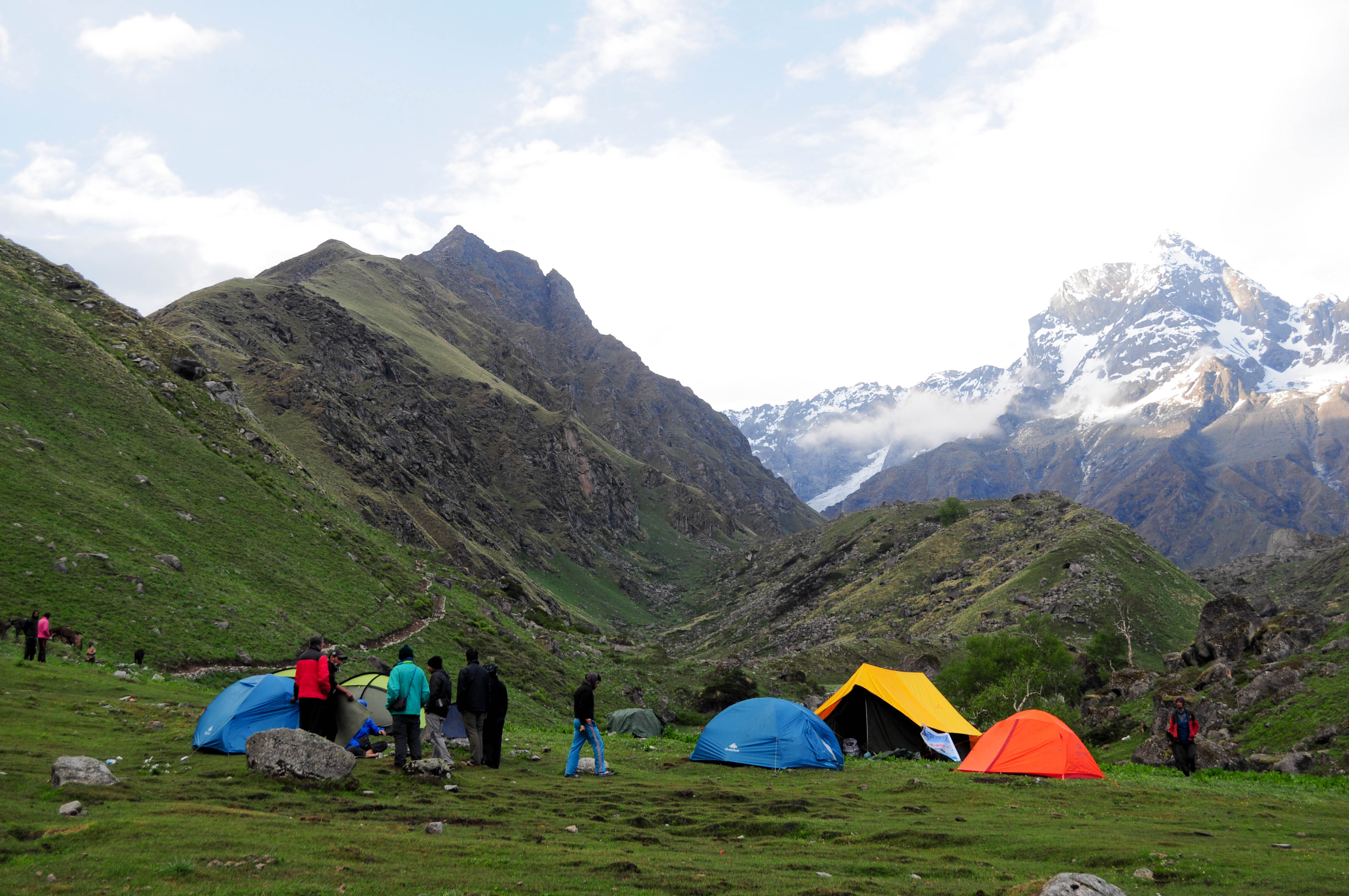 in the middle, which gave us a way to cross it easily. Mt. Thalaysagar started playing hide and seek. There was one loose rockfall section just before the campsite that needed some extra attention. We took intermediate halts with some chitchats and reached the campsite at 12:30. It was a small, plain ground just after the end of the treeline. It barely fit all of us. Big bushes of wild spinach surrounded it. Within a couple of hours, we lost the sunlight. A big sharp mountain wall on our west in the narrow gorge blocked it.